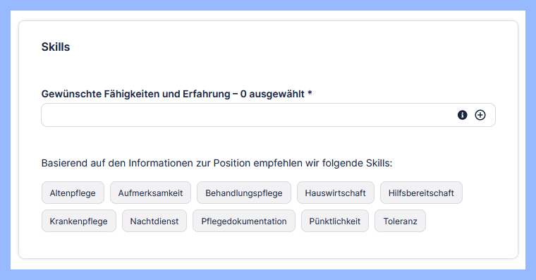 Sobald Sie den Titel ausgewählt haben, werden Ihnen unter „Skills“ automatisch die zum Job passenden Fähigkeiten angezeigt. Wählen Sie eine oder mehrere Fähigkeiten aus, indem Sie auf das entsprechende Feld klicken. Selbstverständlich können Sie auch eigene Skills angeben.