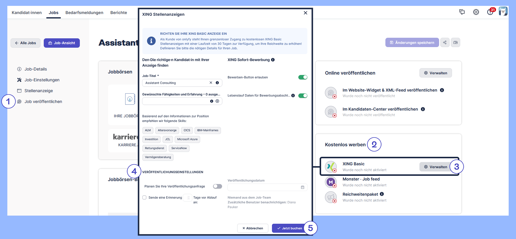Die XING Basic Anzeigen aktivieren Sie im Rahmen der Job-Erstellung, indem Sie im letzten Schritt „Job veröffentlichen“ (1) unter „Kostenlos werben“ (2) auf „XING Basic verwalten“ (3) klicken. Geben Sie im nächsten Fenster das gewünschte Veröffentlichungsdatum an (4) und ― falls gewünscht ― passen Sie die Einstellungen an. Aktivieren Sie die Buchung über den Button „Jetzt buchen“ (5).