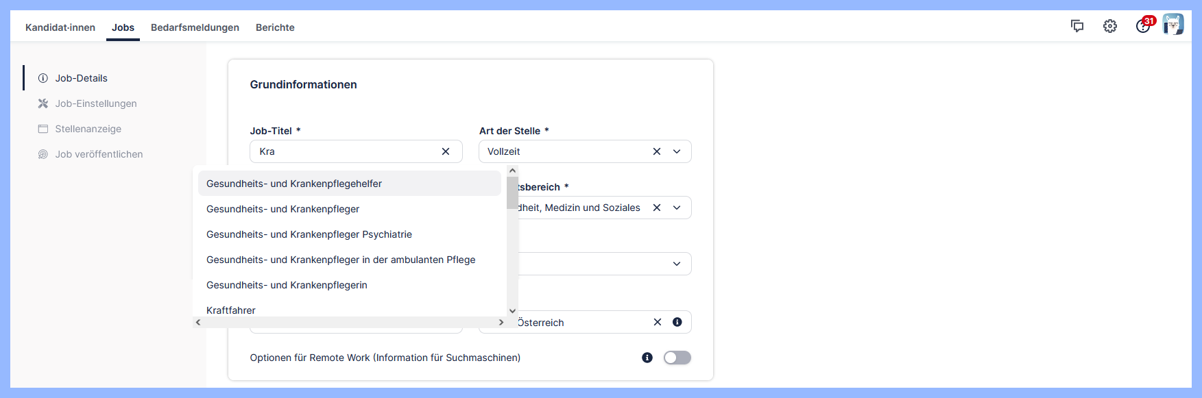 Mithilfe der automatischen Features vom Bewerbungsmanager ist es Ihnen möglich, Stellenanzeigen einfach und intuitiv zu erstellen. Geben Sie zum Beispiel die ersten drei Buchstaben im Feld „Job-Titel“ ein und die passenden Titel werden Ihnen automatisch in einer Liste angezeigt.