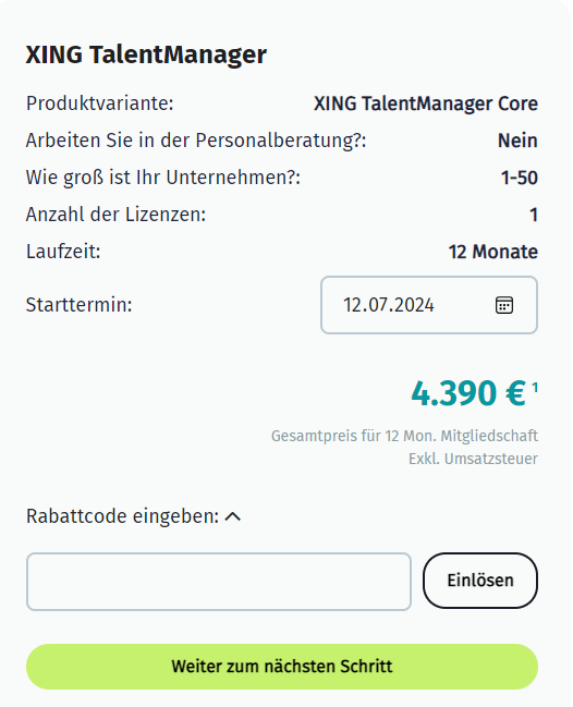 - Wählen Sie auf der Produktseite Ihr gewünschtes XING TalentManager Paket aus.
