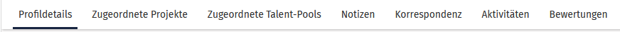 - Aktivitäten (Profilbesuche, angefragte oder abgegebene Bewertungen, geführte Konversationen (versendete Nachrichten), verfasste Notizen, Projekte (in denen das Talent gelistet ist) und vergebener Status