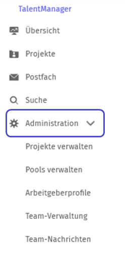 In der Administration des TalentManagers können Administrator·innen verschiedene Einstellungen vornehmen. Hier können Projekte und Pools verwaltet, Einstellungen für die Kandidat·innen-Verwaltung angepasst, Arbeitgeberprofile verknüpft, in der Team-Verwaltung Zugriffsrechte vergeben werden und Einstellungen von Team-Nachrichten konfiguriert werden.