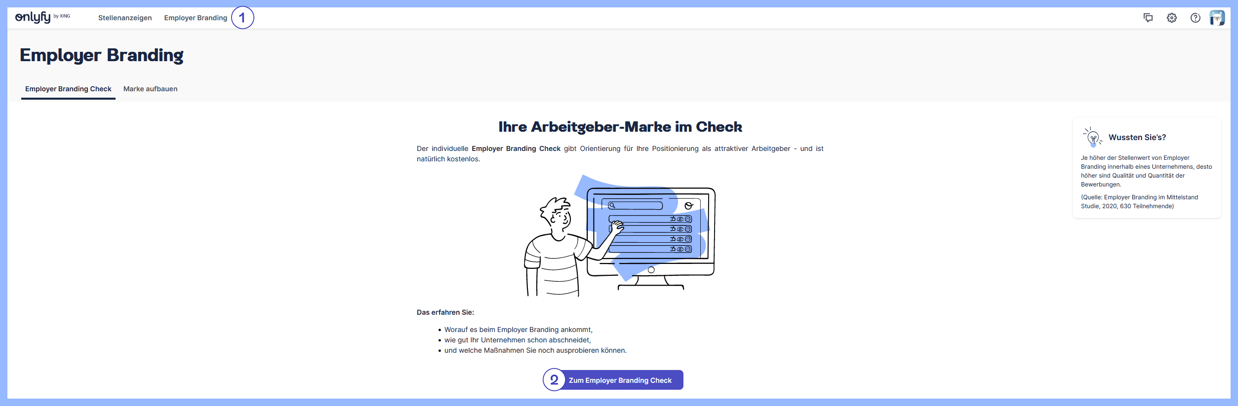 Probieren Sie gleich das erste Feature, den Employer Branding Check. Klicken Sie dazu im XING Jobs Account auf „Employer Branding“ (1) und starten Sie den kostenlosen Selbsttest (2).