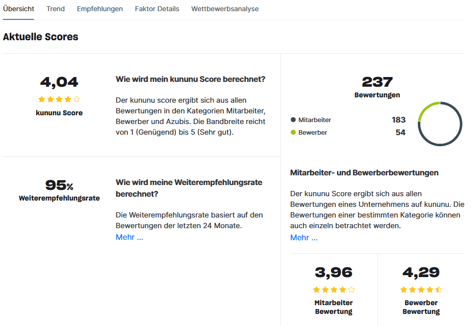 In der Übersicht erhalten Sie eine die Auflistung des kununu-Scores und aller veröffentlichten Bewertungen, sowohl von Mitarbeiter·innen als auch Bewerber·innen.