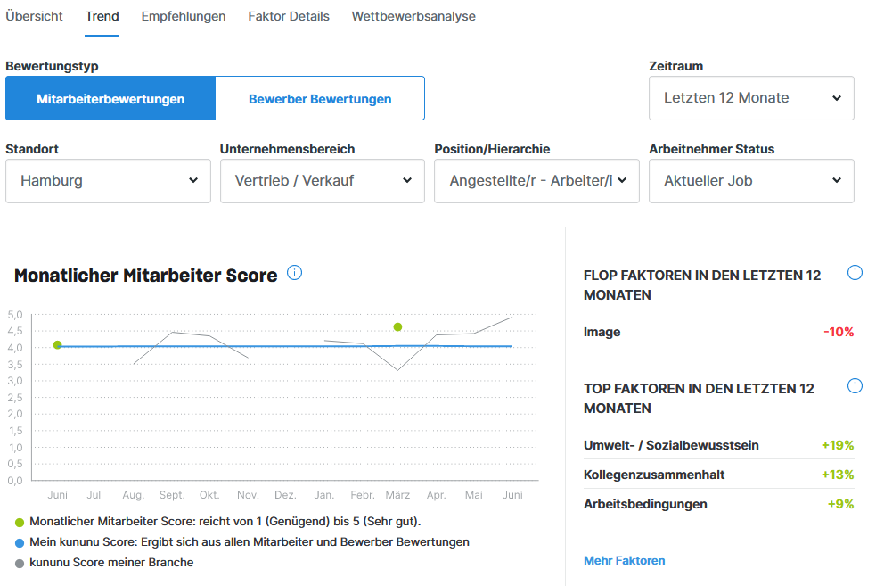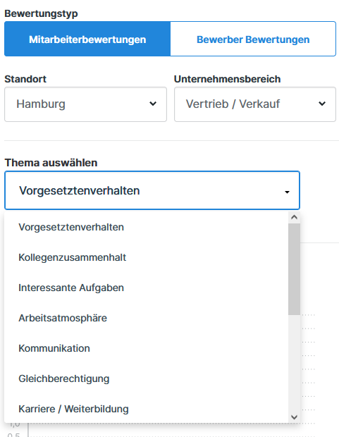 Sie können sich bspw. die Bewertungen aller derzeitigen Mitarbeiter aus dem Bereich Vertrieb/Verkauf am Standort Hamburg der letzten 12 Monate auswerten lassen, um somit "Top- oder Flop"-Faktoren herauszufiltern.