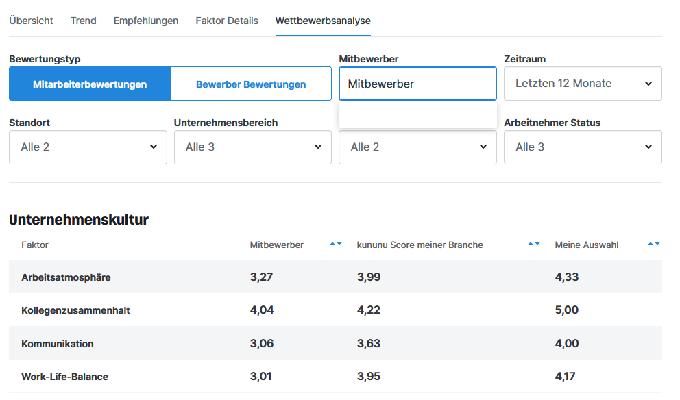 Vergleichen Sie Ihre Bewertungen bzw. die einzelnen Faktoren Ihrer Bewertungskategorien mit einem Mitbewerber Ihrer Wahl.