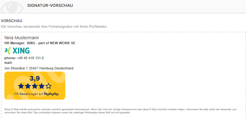 - Im Vorschaufenster sehen Sie nun die Firmensignatur mit Ihren Profildaten.