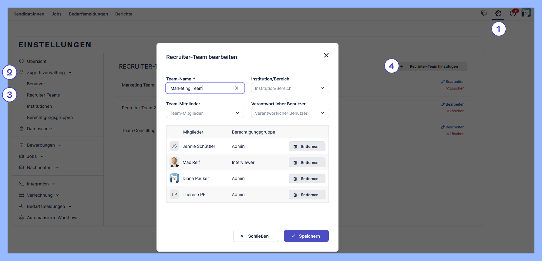 Arbeiten Sie in unterschiedlichen Recruiter-Teams? Erstellen Sie in den „Einstellungen“ (1) > „Zugriffsverwaltung“ (2) > „Recruiter-Teams“ (3) neue Recruiter-Teams (4) und fügen Ihre Kolleg·innen zu den jeweiligen Gruppen hinzu. Ihr Vorteil: Statt alle Beteiligten einzeln hinzuzufügen, geben Sie beim Erstellen eines Jobs nur das zuständige Recruiter-Team an (so, wie zum Beispiel eine Verteilerliste in Outlook).