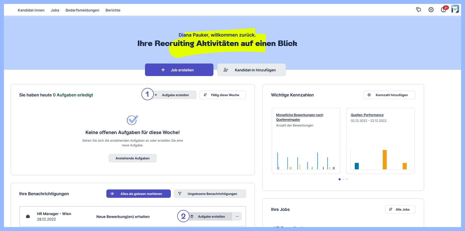 Der Bewerbungsmanager bietet Ihnen gleich zwei Möglichkeiten, direkt auf dem Dashboard Aufgaben zu erstellen:
