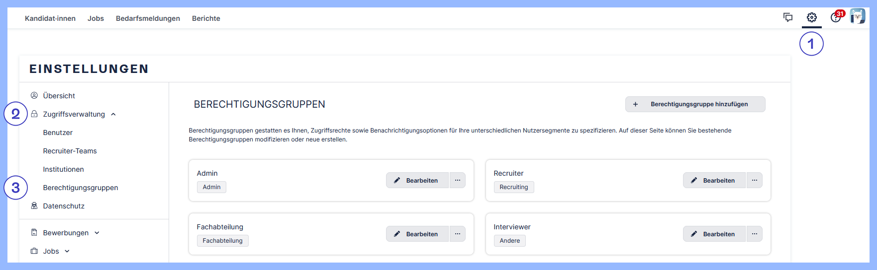 Schaffen Sie Transparenz, indem Sie Ihre Kolleg·innen ins Boot holen und unter „Einstellungen“ (1) > „Zugriffsverwaltung“ (2) > „Berechtigungsgruppen“ (3) zu einem der vorkonfigurierten Berechtigungsgruppen hinzufügen. Somit stellen Sie bereits am Anfang sicher, dass jede Person nur die Informationen sieht, für die sie berechtigt ist.