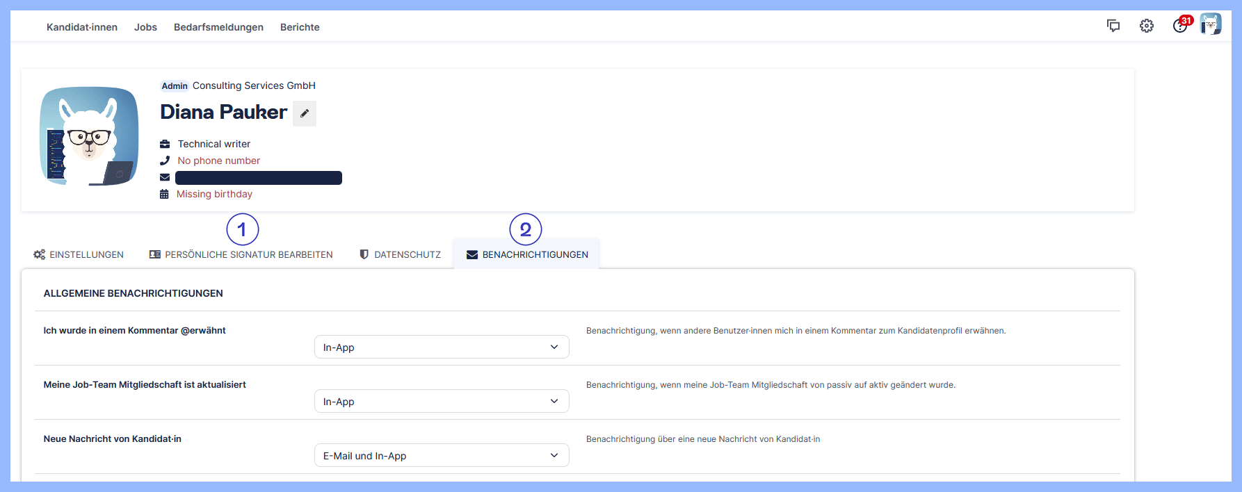 - Benachrichtigungen (2): Definieren Sie in diesem Bereich, wie Sie Benachrichtigungen erhalten möchten: per E-Mail, In-App direkt im Bewerbungsmanager oder auf beidem Wege. Bitte beachten Sie, dass Admins die Änderung der Benachrichtigungen eingrenzen können.