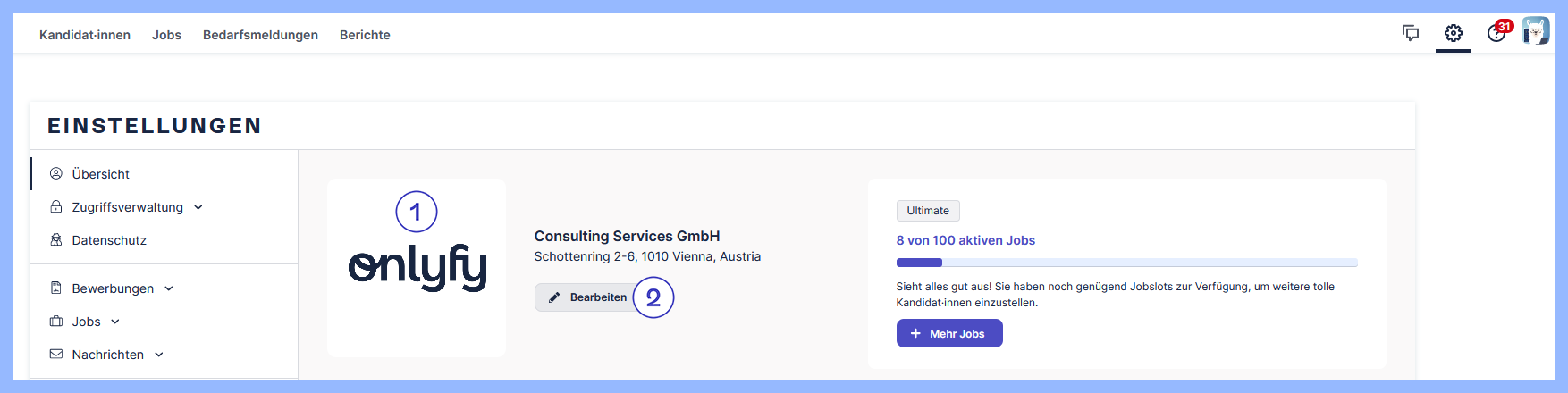 - Unternehmensdaten und Logo: Klicken Sie auf das Foto-Symbol (1), um Ihr Unternehmenslogo hochzuladen. Hinterlegen Sie die Unternehmensdaten, indem Sie auf „Bearbeiten“ (2) klicken.