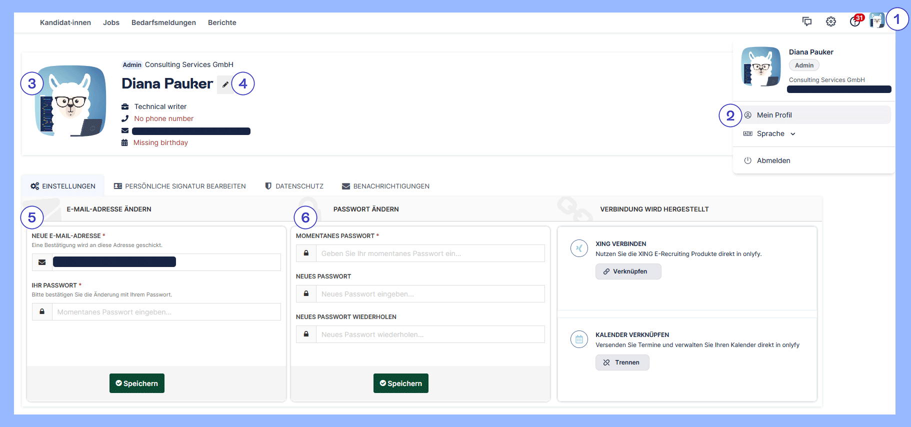 - Passwort (6): Um Ihr Passwort zu ändern, geben Sie Ihr altes und neues Passwort an und klicken auf „Speichern“.