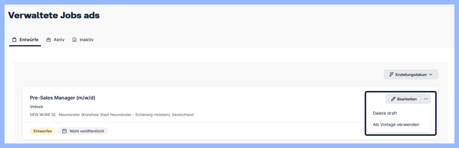 Zusätzlich haben Sie auch die Möglichkeit, aus einem Entwurf direkt eine neue Stellenanzeige zu erstellen. Klicken Sie dazu auf „Als Vorlage verwenden“. Alle Daten werden übernommen und können anschließend bearbeitet werden.