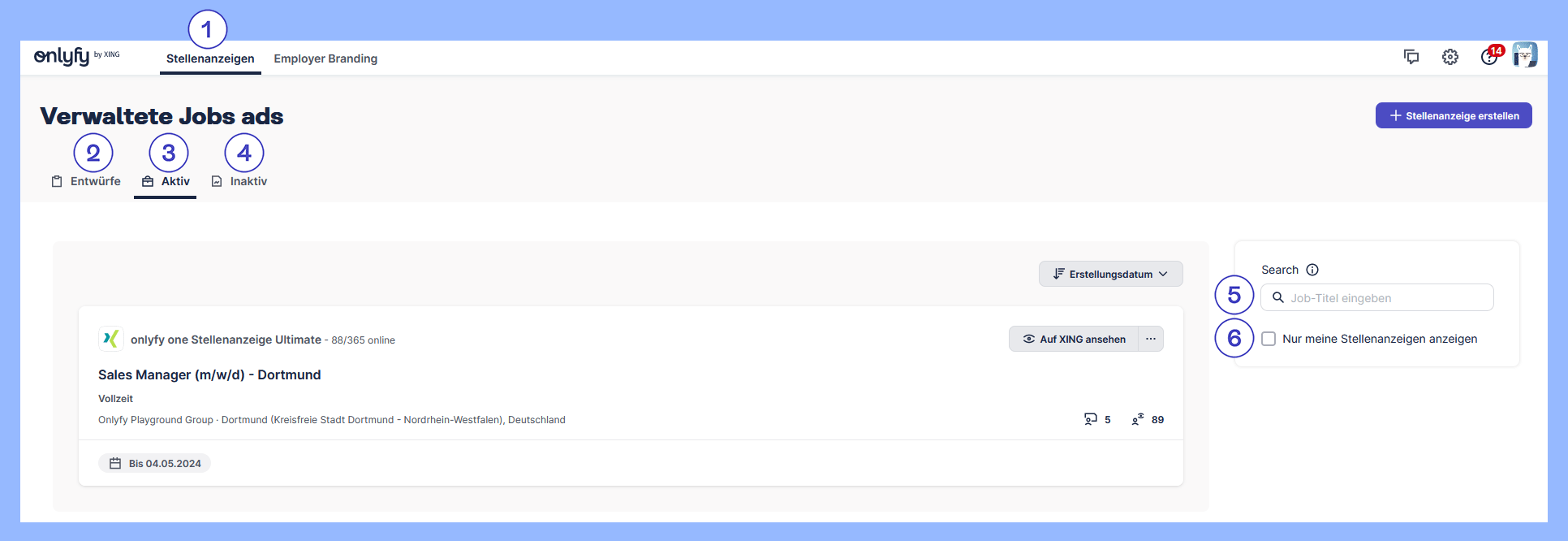 - Aktiv (3): In dieser Ansicht werden alle Stellenanzeigen, die online sind, angezeigt.