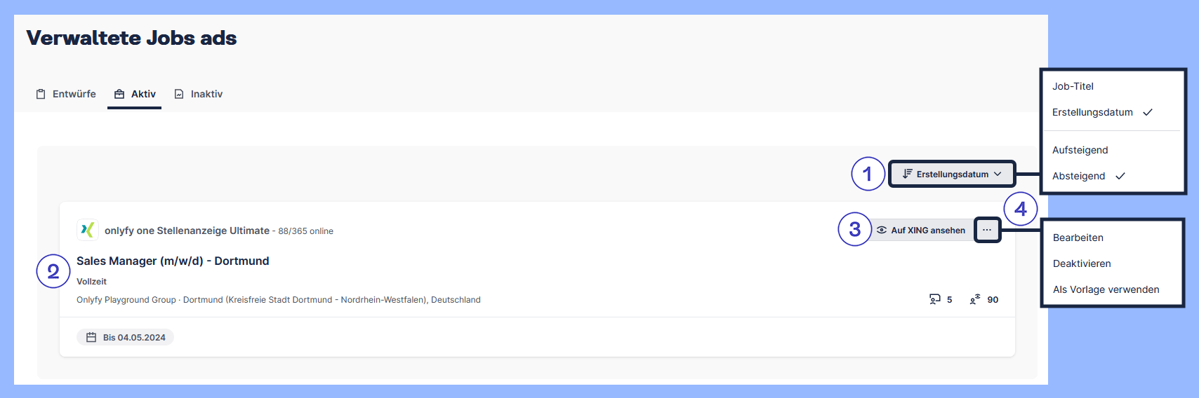 In diesem Bereich sehen Sie alle aktiven Stellenanzeigen, welche absteigend nach Erstellungsdatum sortiert sind. Um die Reihenfolge zu ändern oder nach dem Job-Titel zu filtern, klicken Sie auf „Erstellungsdatum“ (1).