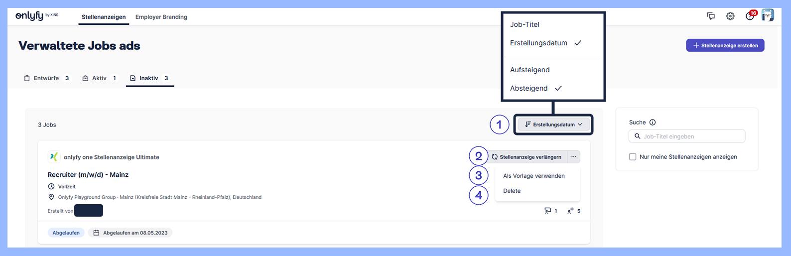Die Reihenfolge der inaktiven Stellenanzeigen können Sie ändern, indem Sie auf „Erstellungsdatum“ (1) klicken.