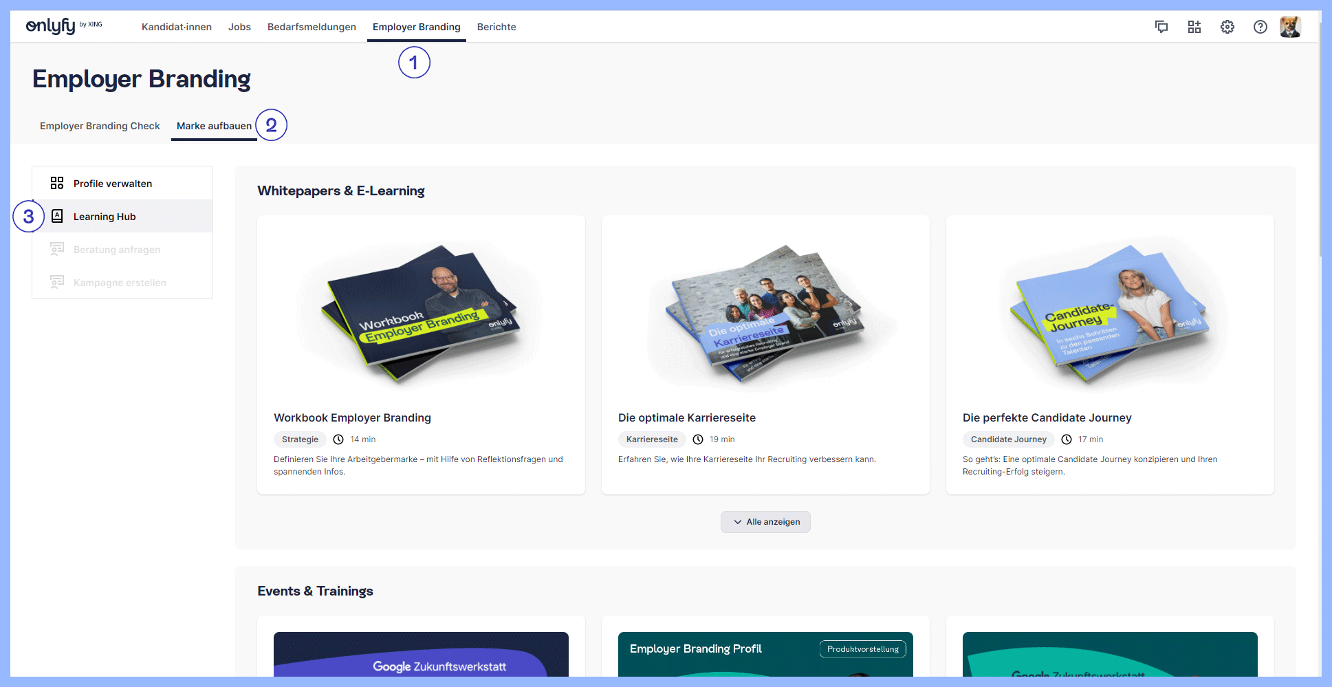 Den Learning Hub finden Sie direkt im onlyfy Bewerbungsmanager unter „Employer Branding“ (1) > „Marke aufbauen“ (2) > „Learning Hub“ (3).
