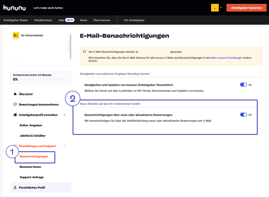 Die Bewertungsbenachrichtigung informiert über neue sowie aktualisierte Bewertungen und ist sowohl für Benutzer·innen mit Berechtigung für ein Employer Branding Profil als auch Benutzer·innen von Gratisprofilen, welche für die Kommentarfunktion freigeschaltet sind, verfügbar.
