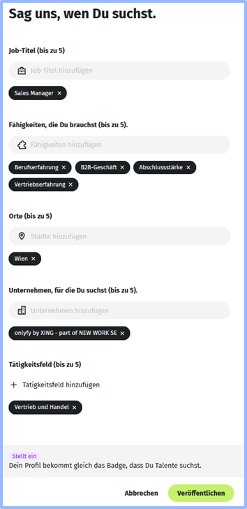 - Sie können zusätzlich Auswahlkriterien hinzufügen, z. B. bestimmte Fähigkeiten oder Tätigkeitsfelder.