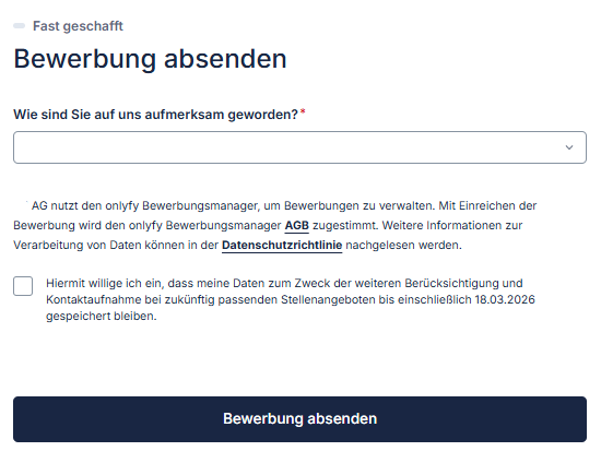 Vorm Absenden der Bewerbung müssen Bewerbende nur noch eine Einwilling tätigen. Sie haben hier die Möglichekit eine abschließende Frage zu stellen.