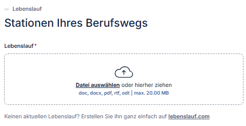 - „Aus Datei importieren“: Den Lebenslauf können die Bewerbenden auch als Datei hochladen. Folgende Formate sind erlaubt: doc, docx, pdf, rtf, odt.