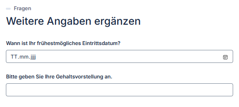 Bei Bedarf können Sie den Kandidat·innen bereits im Rahmen der Bewerbung zusätzliche Fragen stellen oder Dokumente, wie zum Beispiel Führerscheinkopie oder Arbeitszeugnis, anfordern. Zum Hochladen sind folgende Dokumentformate erlaubt: doc, docx, pdf, rtf, txt, htm, html, png, jpeg, jpg, bmp, xls, xlsx, ppt, pptx, zip, odt. Lesen Sie weitere Details über Fragebögen in unserem Artikel „Zusatzfragen und Fragebögen erstellen“.