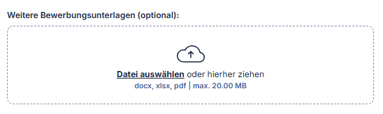 Bei Bedarf können Sie den Kandidat·innen bereits im Rahmen der Bewerbung zusätzliche Fragen stellen oder Dokumente, wie zum Beispiel Führerscheinkopie oder Arbeitszeugnis, anfordern. Zum Hochladen sind folgende Dokumentformate erlaubt: doc, docx, pdf, rtf, txt, htm, html, png, jpeg, jpg, bmp, xls, xlsx, ppt, pptx, zip, odt.