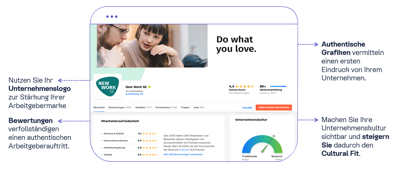 Das kununu Gratis-Unternehmensprofil steht jedem Arbeitgeber zur Verfügung - komplett ohne versteckte Nebenkosten. Wie ein kununu Profil angelegt wird, können Sie hier direkt nachlesen.