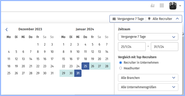 - Loggen Sie im TalentManager ein. Gehen Sie im linken Navigationsmenü auf Recruiter Insights. Im Bereich "Ihre Performance", "Team-Übersicht" und "Ihre Kolleg∙innen" haben Sie oben rechts die Möglichkeit den Zeitraum individuell auszuwählen.