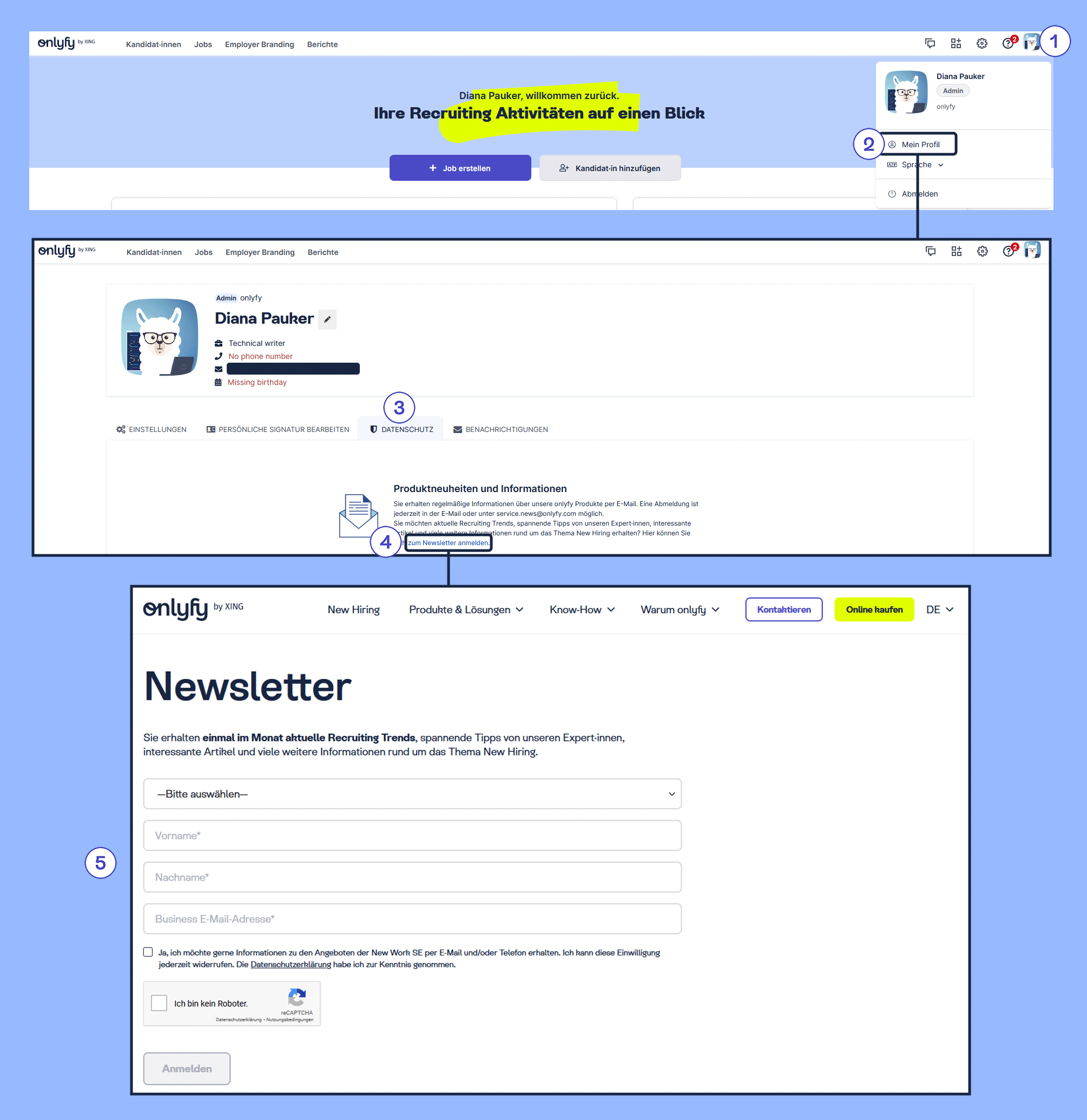 Die Anmeldung zum onlyfy Newsletter können Sie bequem über onlyfy one durchführen. Loggen Sie sich in Ihr onlyfy one Konto ein, klicken auf Ihr Profilfoto (1) > „Mein Profil“ (2) und wählen im nächsten Schritt „Datenschutz“ (3) aus. Unter „Produktneuheiten und Informationen“ finden Sie den Link zur Anmeldung (4). Tragen Sie im letzten Schritt noch Ihren Namen und Ihre E-Mail-Adresse ein (5) und schon sind Sie für den Newsletter angemeldet.
