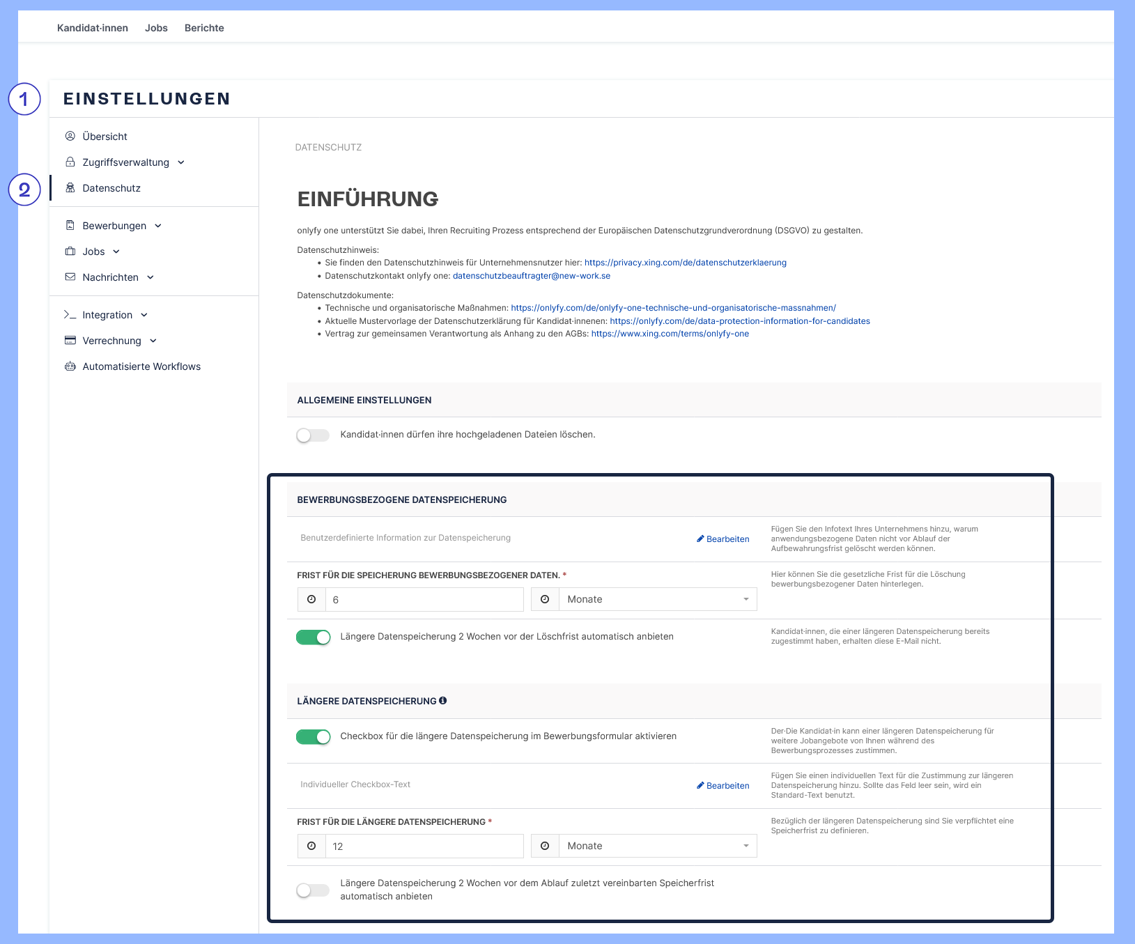 Nutzen Sie auch die Möglichkeit die Daten Ihrer Talente länger zu speichern und ihnen automatisch eine längere Datenspeicherung anzubieten. Dies können Sie einfach unter „Einstellungen“ (1) > „Datenschutz“ (2) einrichten.