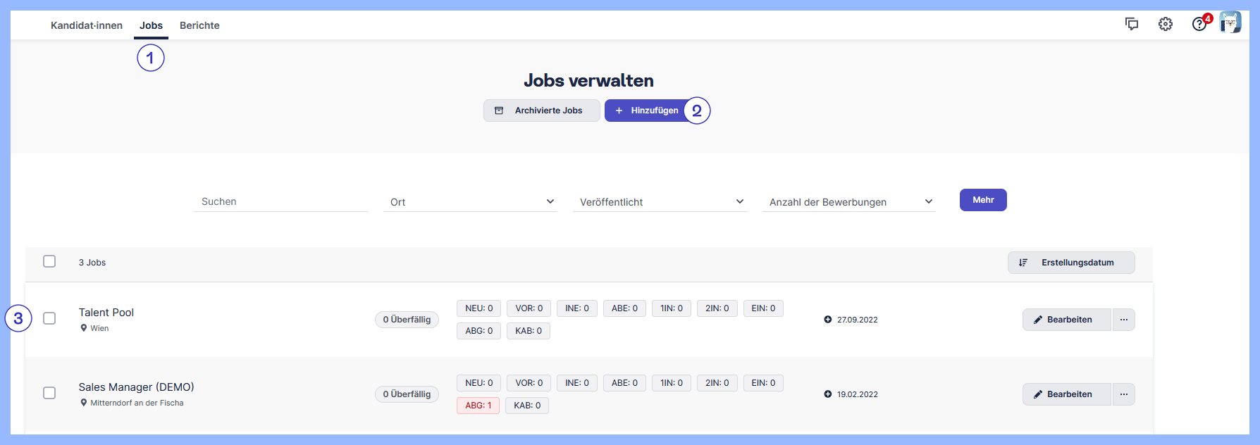 Erstellen Sie einen eigenen Job für Ihren Talent Pool unter „Jobs“ (1) > „Hinzufügen“ (2) und verwalten Sie Ihre Talente in diesem Job (3). Der Vorteil hierbei ist, dass Sie einen eigenen Recruiting-Prozess festlegen können. Die Segmentierung kann somit auch über den Status im Recruiting-Prozess erfolgen.