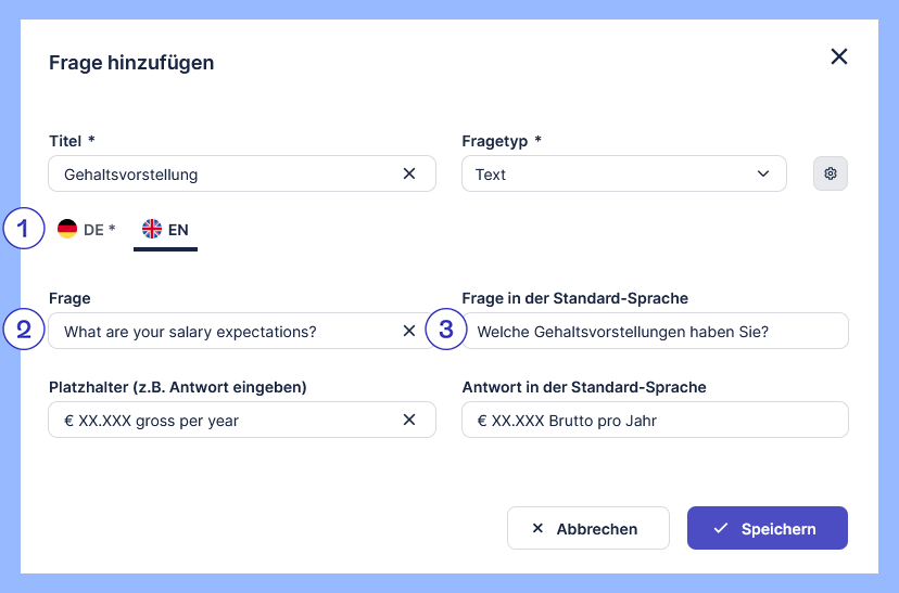 Formulieren Sie die Zusatzfrage zuerst in der Standardsprache und klicken anschließend auf die gewünschte Sprache. Hier tragen Sie die Übersetzung ein (2). Als Referenz sehen Sie auf der rechten Seite die Informationen in der Standardsprache (3). Sie müssen nicht alle Sprachen übersetzen, wir empfehlen Ihnen jedoch auf die Vollständigkeit der Übersetzungen zu achten.