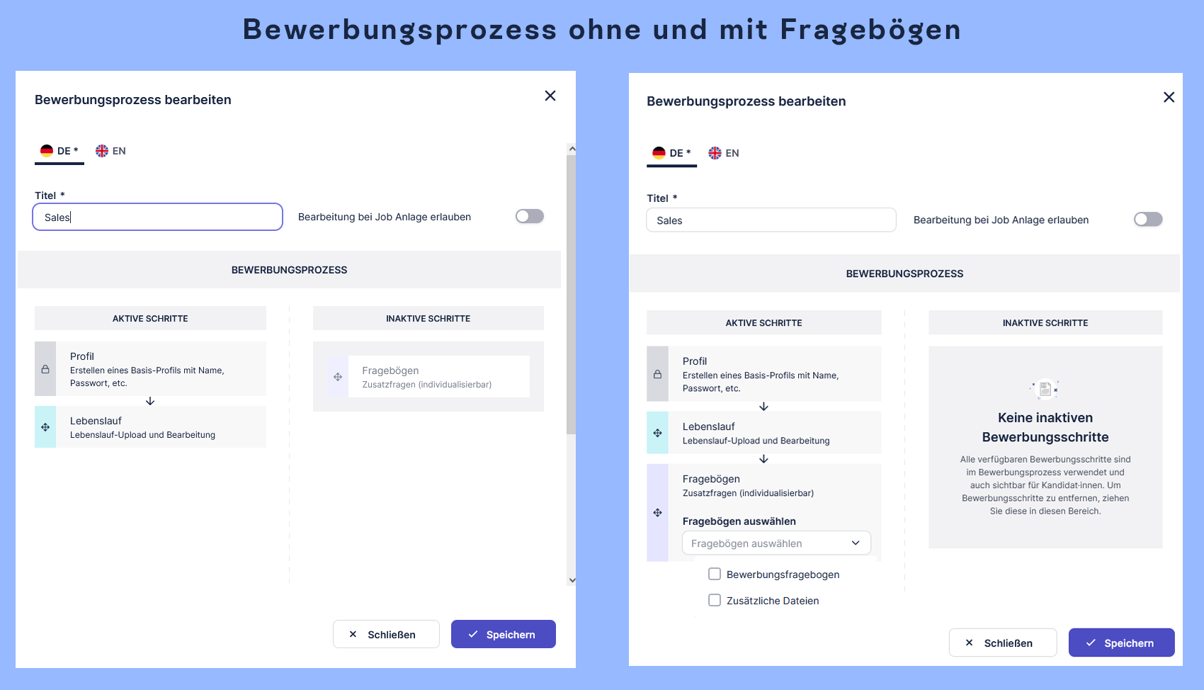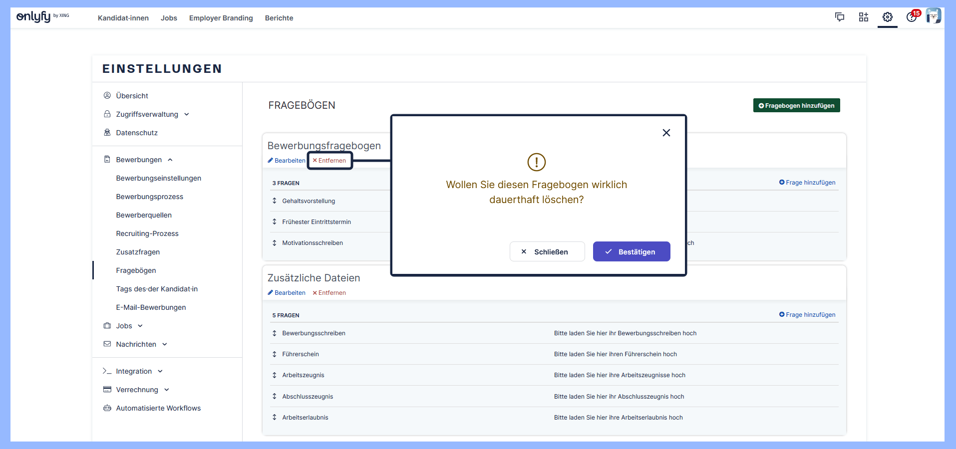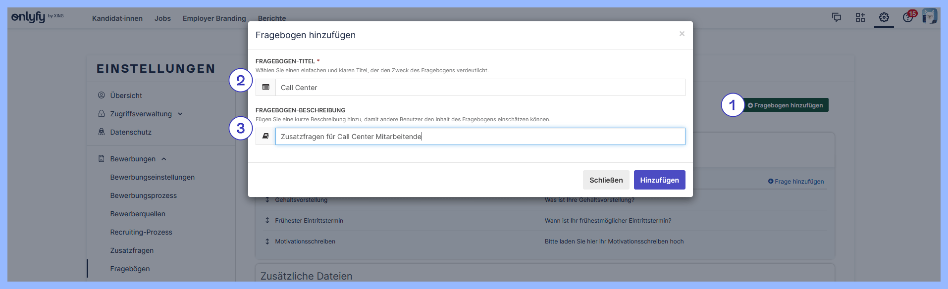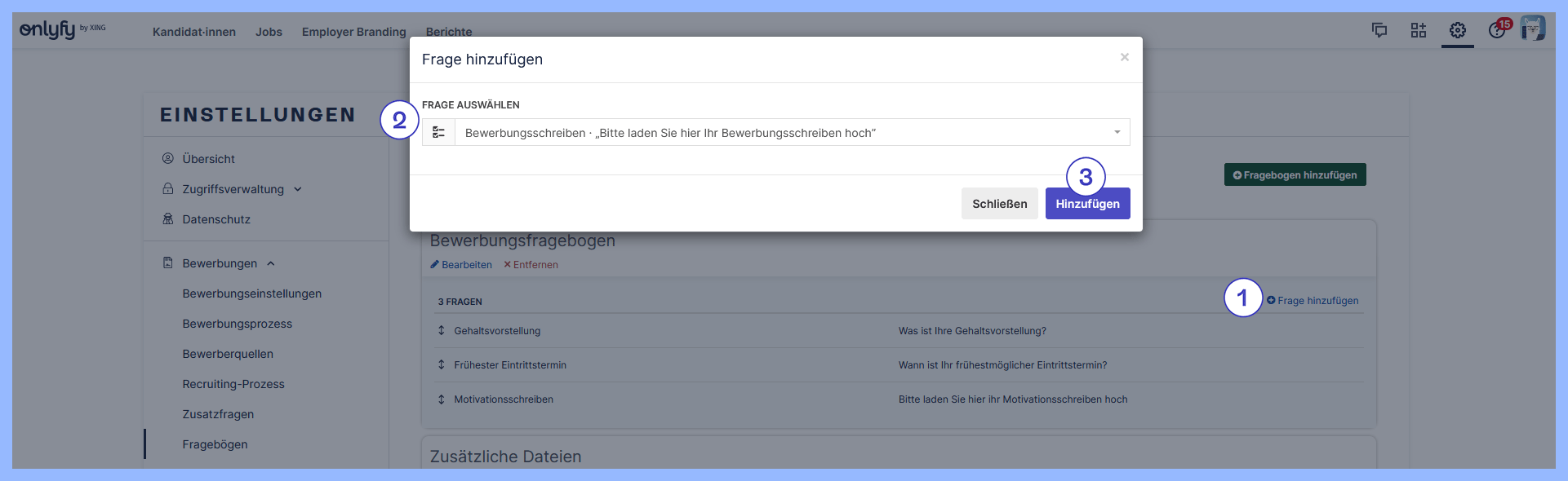 Zusatzfragen und Fragebögen im Bewerbungsprozess hinzufügen