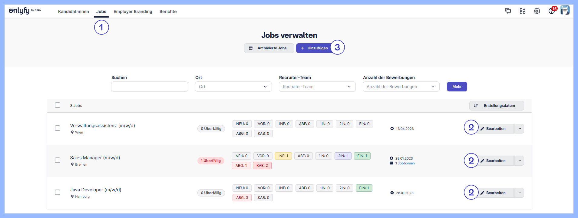 Möchten Sie den Bewerbungsprozess für einen einzelnen Job ändern? Dies ist direkt im Rahmen der Job-Erstellung möglich. Öffnen Sie einen bestehenden Job (1) mittels „Bearbeiten“-Button (2) oder erstellen Sie einen neuen mit „Hinzufügen“ (3).