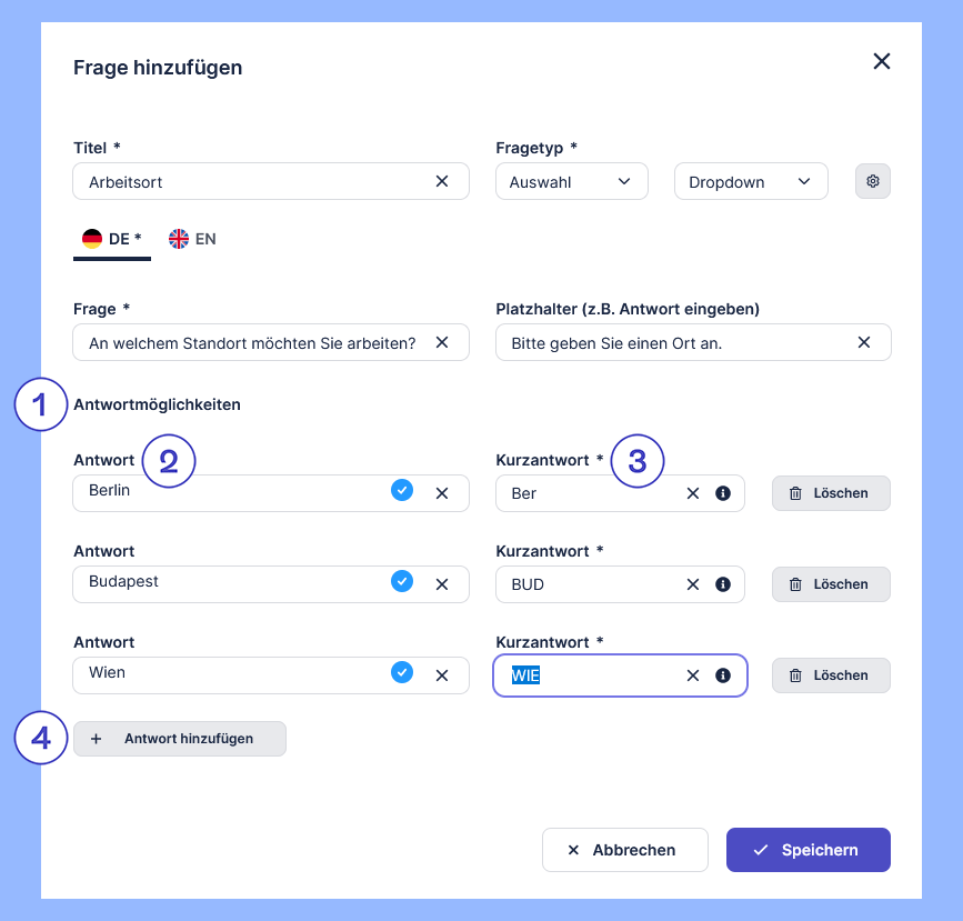 Sobald Sie Ihre Auswahl getroffen haben, wird das Feld „Antwortmöglichkeiten“ (1) aktiviert. Sie können Ihre Antwortalternativen in die folgenden zwei Felder eintragen: