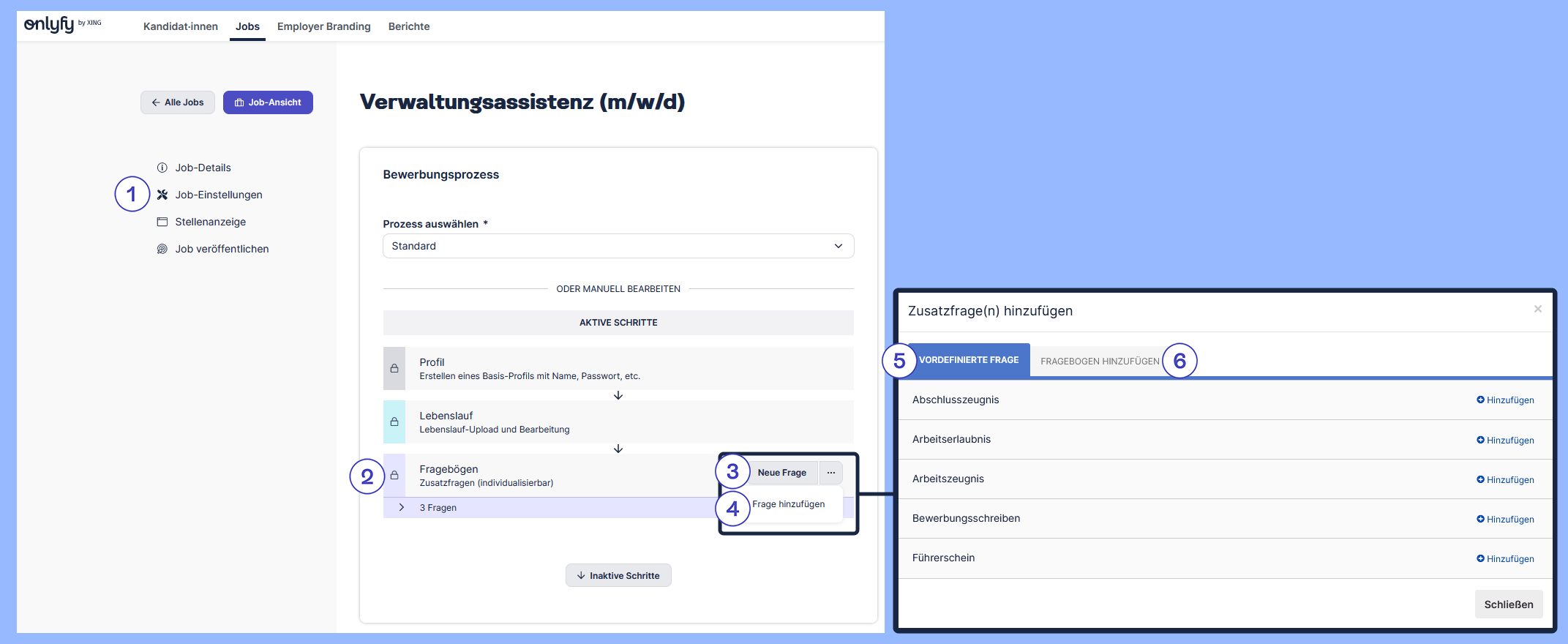 - „Frage hinzufügen“ (4): Klicken Sie auf die drei Punkte und anschließend auf den Button „Frage hinzufügen“. Im nächsten Schritt finden Sie alle Ihre Zusatzfragen (5) und Fragebögen (6) auf zwei Reiter verteilt. Klicken Sie auf den „Hinzufügen“-Button um die Frage oder den Fragebogen in Ihren jobspezifischen Bewerbungsprozess aufzunehmen.