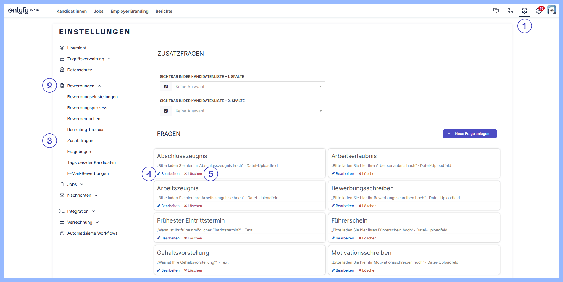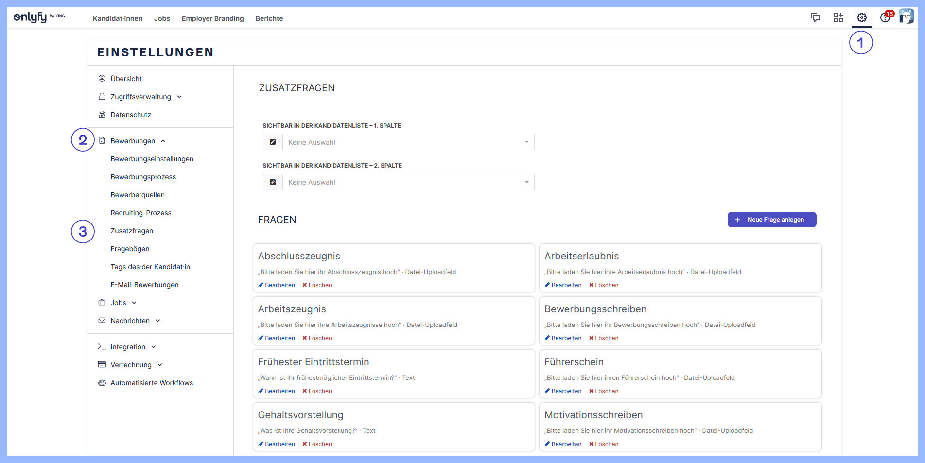 Ihre Fragen verwalten Sie in der Zusatzfragen-Übersicht unter „Einstellungen“ (1) > „Bewerbungen“ (2) > „Zusatzfragen“ (3):