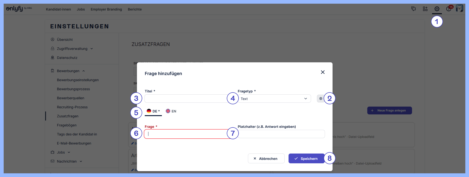 - „Neue Frage“ (3): Erstellen Sie eine neue Frage und fügen Sie diese direkt im Bewerbungsprozess ein.