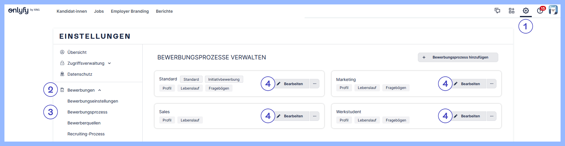 Um Ihren Standardprozessen Fragebögen hinzuzufügen, gehen Sie zu den „Einstellungen“ (1) > „Bewerbungen“ (2) > „Bewerbungsprozess“ (3). Wählen Sie den gewünschten Prozess aus und klicken auf „Bearbeiten“ (4).