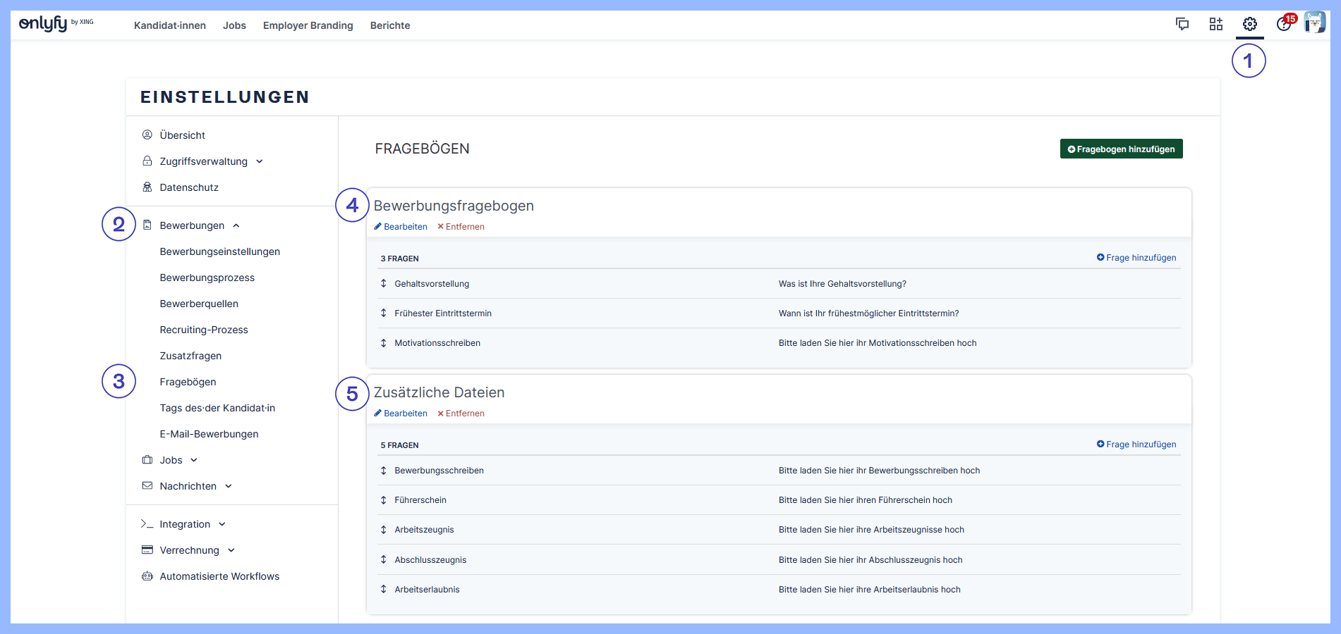 Fragebögen können Sie unter „Einstellungen“ (1) > „Bewerbungen“ (2) > „Fragebögen“ (3) verwalten. Wir stellen Ihnen zwei vordefinierte Fragebögen standardmäßig zur Verfügung: