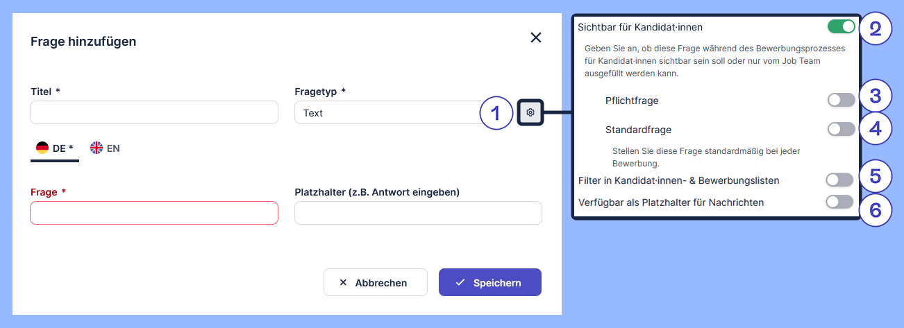 (2) „Sichtbar für Kandidat·innen“: Bestimmen Sie, ob die Frage nur intern für Sie und Ihr Team oder auch für Kandidat·innen sichtbar sein soll. Die Funktion ist standardmäßig aktiviert. Bitte beachten Sie, diese Einstellung kann nicht mehr geändert werden, sobald die Frage erstellt wurde.