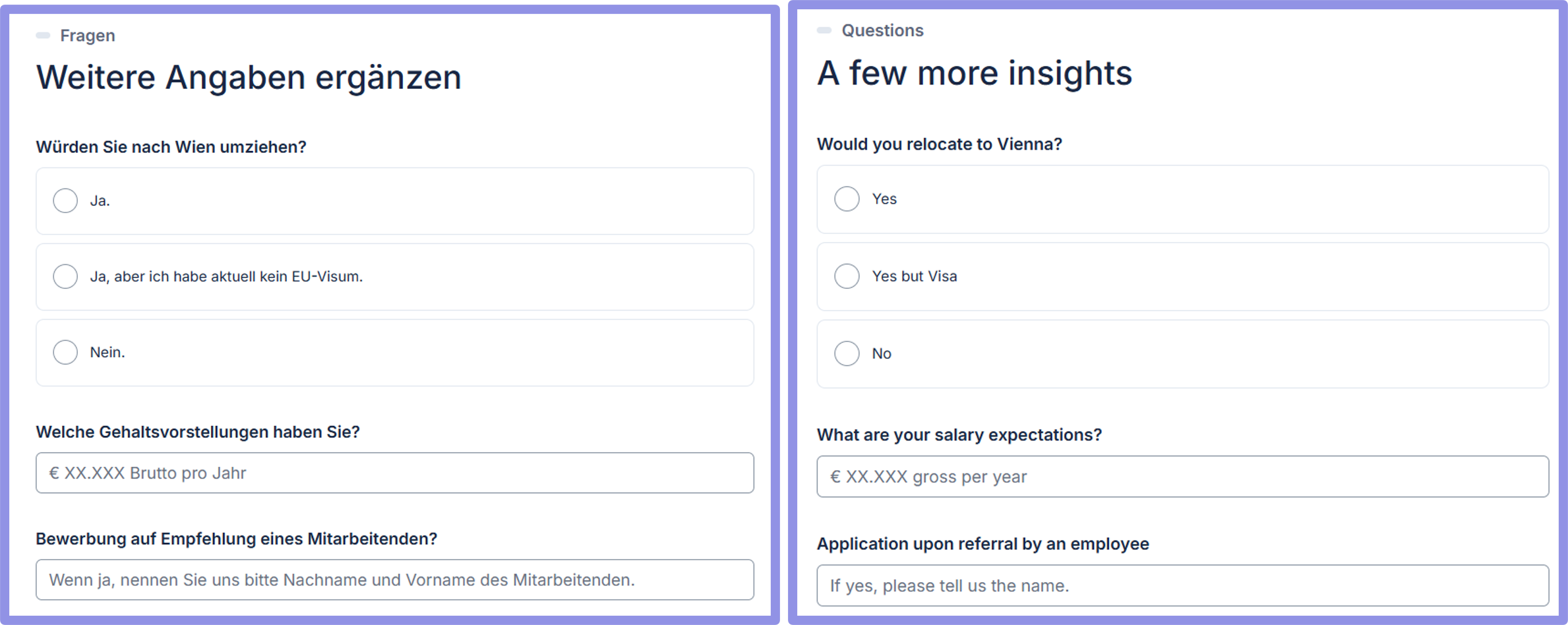 - Die Anzeigesprache wird anhand der Browser-Einstellungen der Kandidat·innen oder an den Spracheinstellungen im Kandidat·innen-Center festgelegt.