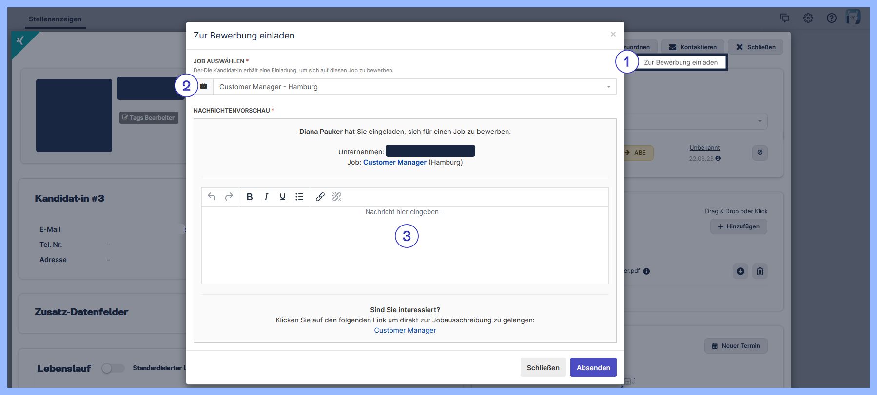 Möchten Sie Ihren Bewerber·innen einen interessanten Job in Ihrem Unternehmen empfehlen, so schicken Sie ihnen eine Nachricht inklusive dem Link zur Bewerbung, indem Sie hier auf „Zur Bewerbung einladen“ klicken (1). Wählen Sie aus der Liste die entsprechende Stelle aus (2) und schreiben Sie eine persönliche Nachricht (3).
