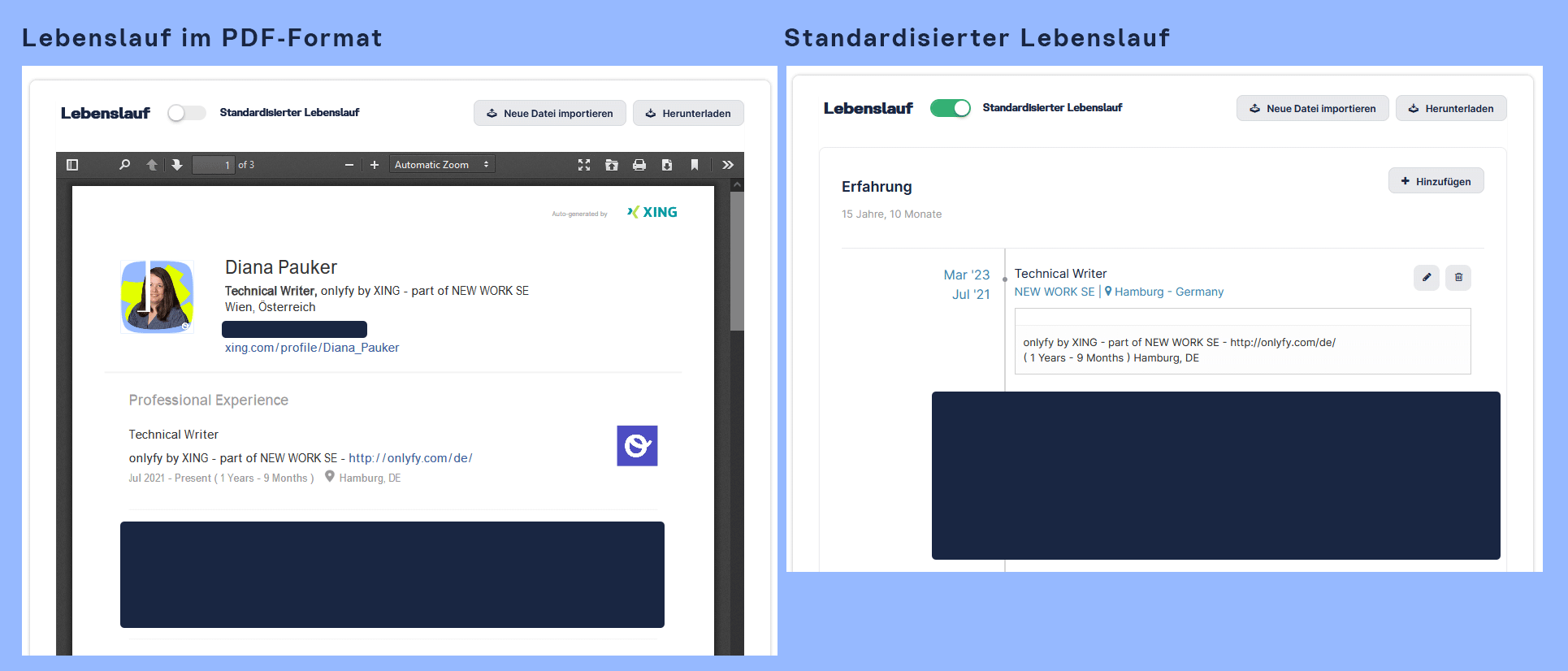 Über „Neue Datei importieren“ können Sie einen Lebenslauf auch manuell hochladen. Bitte beachten Sie, dass in diesem Fall folgende, bestehende Daten überschrieben werden: