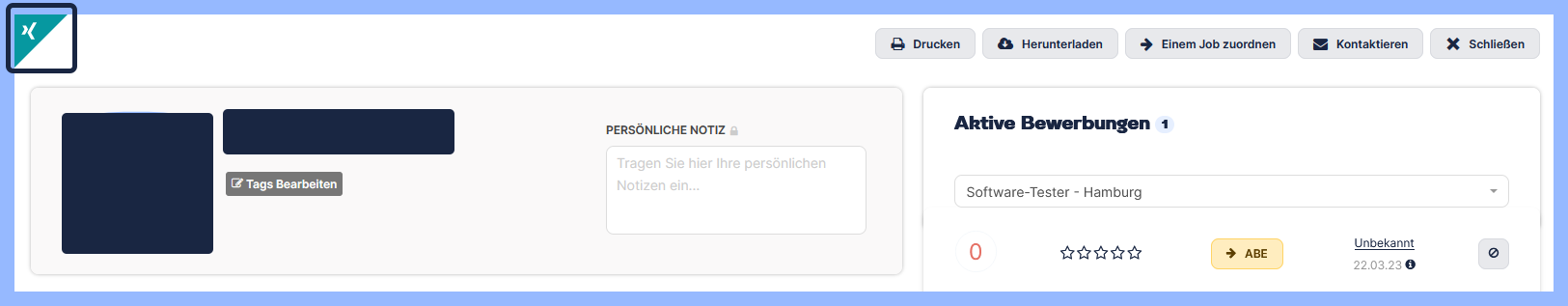 Bewerben sich Ihre Kandidat·innen via XING Sofort-Bewerbung, so wird dieses Profil oben links mit einem XING-Icon gekennzeichnet.
