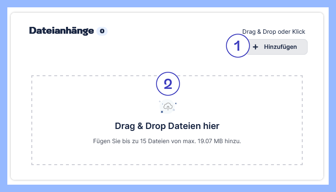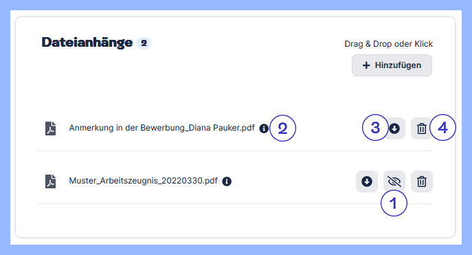 In diesem Abschnitt werden die Dokumente Ihrer Kandidat·innen angezeigt. Laden Sie weitere Dokumente hoch, indem Sie entweder auf „Hinzufügen“ (1) klicken oder per Drag & Drop auf das Feld „Dateianhänge“ (2) ziehen. Sie können gerne mehrere Dateien gleichzeitig hochladen.
