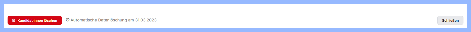 Am Ende des Kandidat·innen-Profils sehen Sie, wann die automatische Datenlöschung stattfindet. Zusätzlich haben Sie die Möglichkeit die Daten Ihrer Kandidat·innen sofort zu löschen. Bitte beachten Sie, dass gelöschte Daten nicht wiederhergestellt werden können.