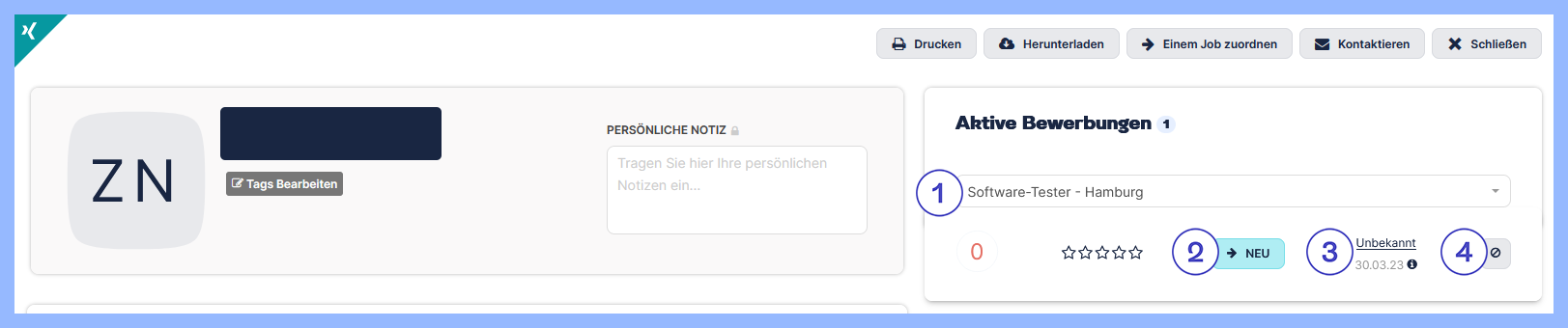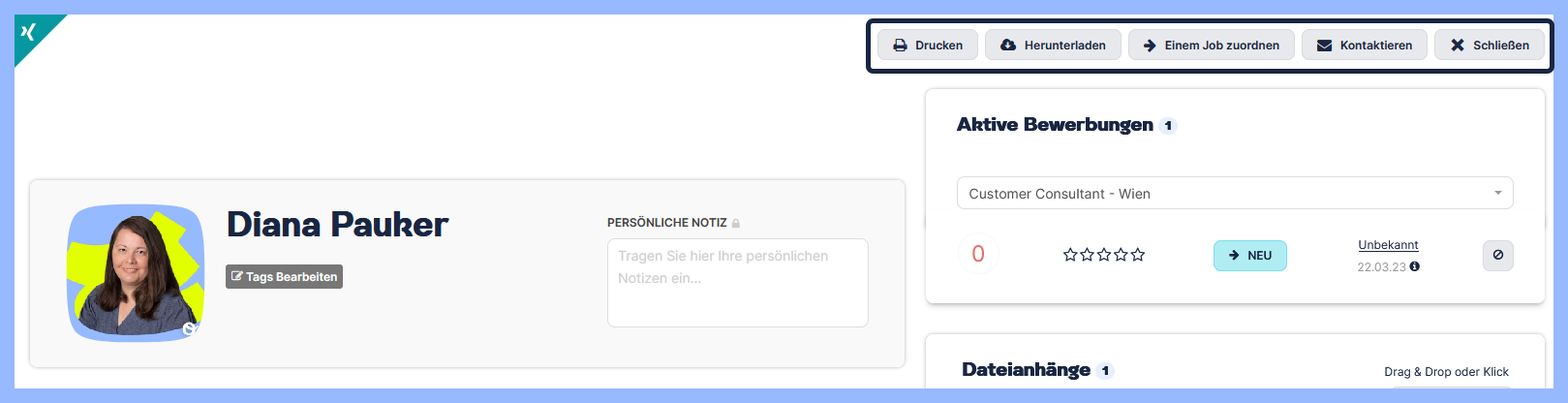 - „Anonymes Kandidatenprofil herunterladen“: Möchten Sie Bewerbungen anonym oder extern weitergeben? Laden Sie das Kandidat·innen-Profil über dieses Button runter und die persönlichen Daten, wie Name, Geburtsdatum usw., werden nicht angezeigt.